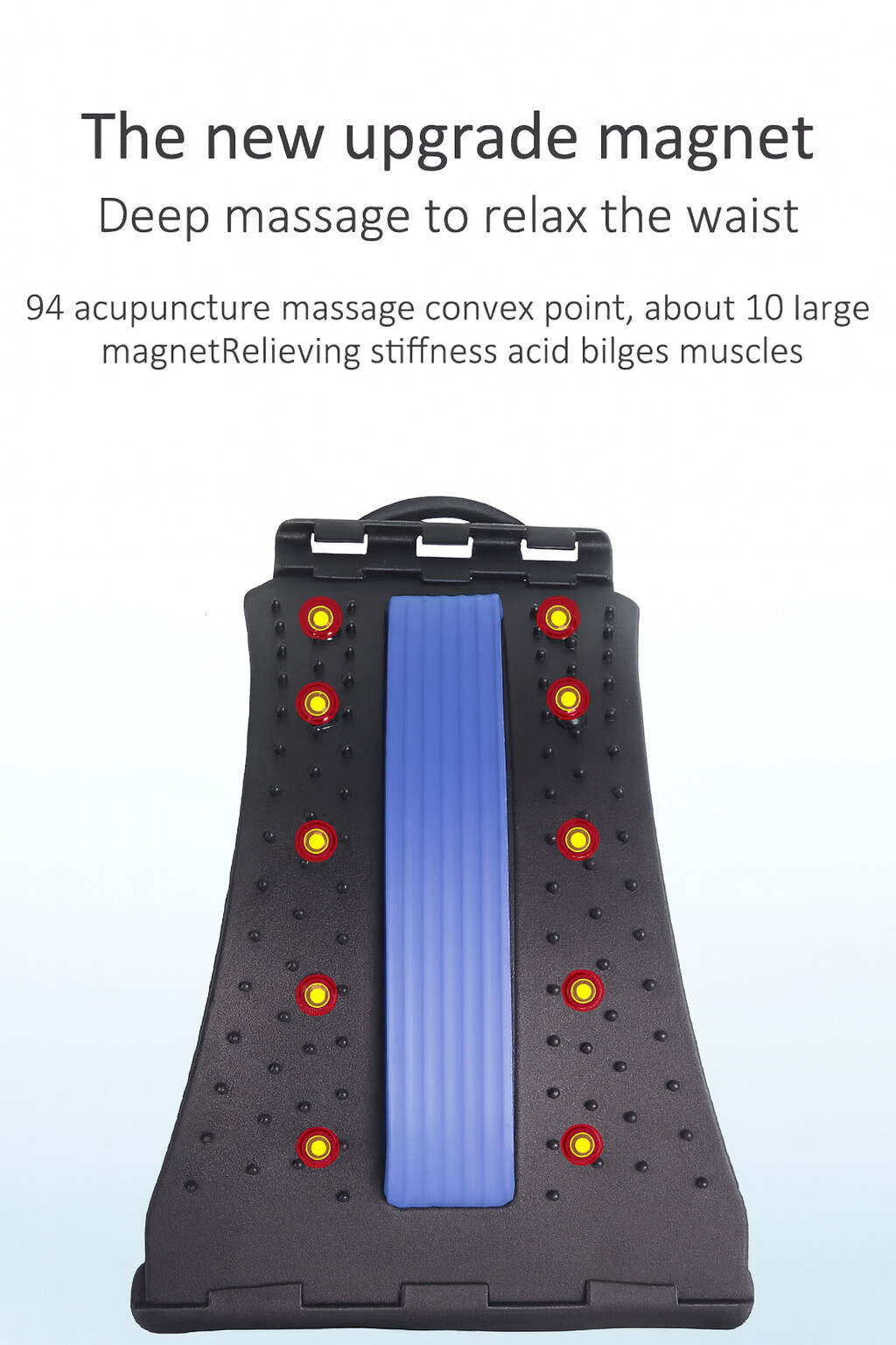 Suprafața dispune de 94 de puncte de presopunctură și 10 magneți integrați, care stimulează circulația locală și contribuie la detensionarea musculaturii. Cele 4 trepte de reglare îți permit să ajustezi gradul de întindere în funcție de preferințe și nivelul de confort.